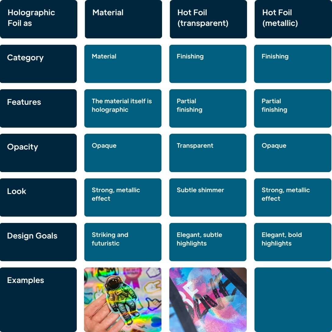 Transparent Holographic Hot Foil: This subtle option allows your design to shine through. Your artwork is printed first, and then selected areas are enhanced with a transparent foil that adds a rainbow-like effect. The underlying colours remain fully visible while the foil catches the light, creating a refined, eye-catching appearance.